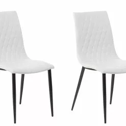 Este conjunto de 2 sillas de comedor de estilo elegante encaja bien con cualquier interior moderno o clásico. Está fabricado a partir de piel sintética de alta calidad. El asiento acolchado combina bien con las patas de metal con recubrimiento en polvo. El diseño sin reposabrazos ofrece la máxima comodidad.