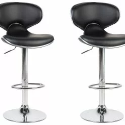Añade a tu interior este conjunto de 2 sillas de bar elegante y funcional. El asiento está tapizado en piel sintética y la base, fabricada a partir de metal resistente. Puedes regular la altura con el elevador de gas neumático. Ideal para cualquier barra de cocina.
